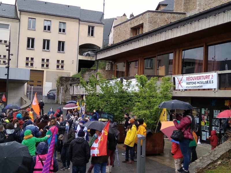 A l’appel d’une intersyndicale CGT/FO/FSU/Solidaires/UNSA/CFDT/CFDT, 300 personnes se sont mobilisés, malgré la pluie, au cours d’une manifestation festive animée par des interventions artistiques impromptues du collectif « On rouvre LOZERE » conclue sur le parvis du théâtre par un concert revendicatif